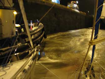 19 H15. Nous sommes à Gatun, il fait nuit noire. Nous avons trois écluses accolées à franchir pour une élévation de 26 Mètres . Nous nous mettons à couple de Rea et suivons les instructions des pilotes. Nous devons passer les écluses à couple d'un remorqueur. Julo est à l'extérieur. Nous n'aurons donc aucune manśuvre d'aussière…. C'est confortable.