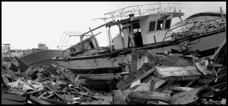 Les bateaux saisis sont crachés sur un terrain vague . Quelques affaires perso jonchent le sol. L'air est lourd de pleurs, de cris, de misère.... Ou est passé l'espoir? Ici, tout est désolation, ici s'arretent les rêves, ici la mort est palpable... |