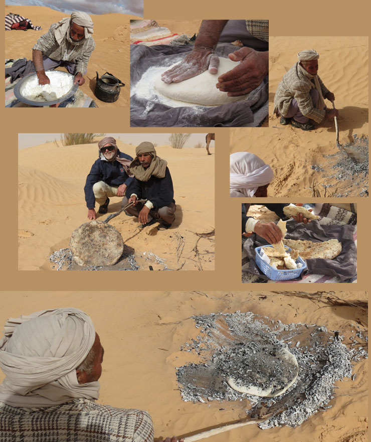 Matin et soir, Mahsou nous régale avec le pain du désert. Une fois la pâte à pain pétrie, il suffit de l'étaler puis de la recouvrir de braises puis de sable. 20 minutes de cuisson suffisent pour obtenir un bon pain bien croustillant qui, une fois bien essuyé, est dégusté sans modération. Trempé dans de l'huile d'olive et un chouya d'harissa…. Un délice. |