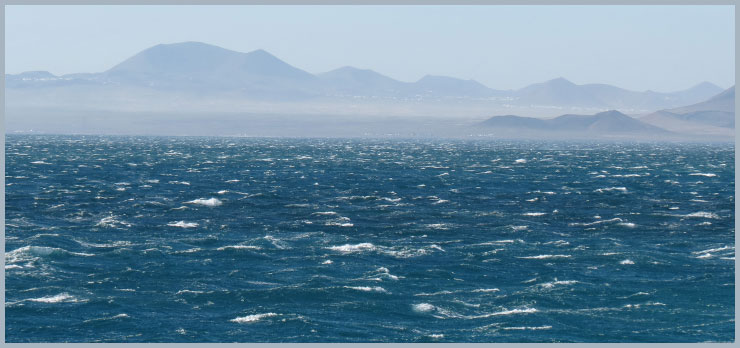 Et le vent va souffler pendant toute cette escale. Ces vents de secteur Sud-est sont plutôt faibles au large, force 2 à 3. L'île de Lanzarote, juste à coté comprime le flux qui redescend ensuite des hauteurs en accélérant et c'est un bon force 7 à 8 qui déboule dans le port. Impressionnant. Même marcher sur les pontons devient acrobatique. |