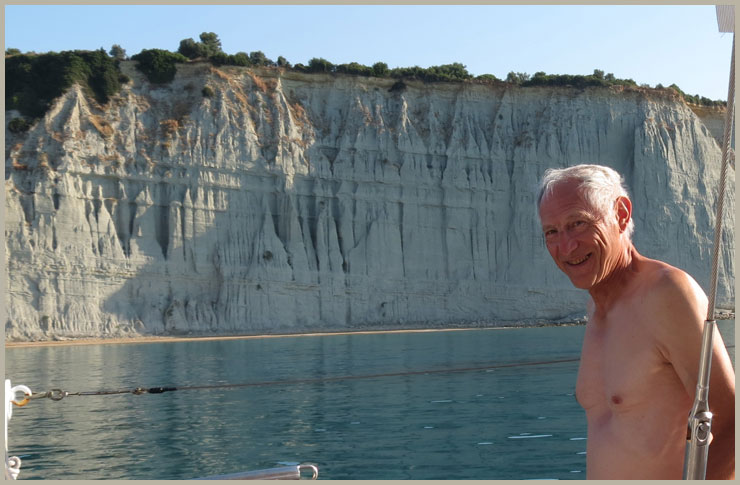 Nous descendons plus au Sud pour l'île de Céphalonie. Une traversée d'une quarantaine de milles. Le vent annoncé n'est pas au rendez-vous et nous faisons route moteur. Passée la pointe Sud-est de l'île, le vent se lève, mais dévié par le relief il est pile dans l'axe. La mer est courte et arrête le bateau. Nous tirons des bords « moteur/GV » et cherchons un mouillage pour la nuit. C'est au pied d'une magnifique falaise que nous trouvons refuge. C'est un peu rouleur, mais c'est grandiose.