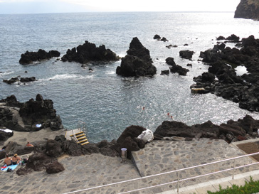 Cette année la Météo est capricieuse. L'anticyclone des Açores monte parfois si Nord que de petites dépressions passent à son sud, c'est-à-dire sur nous. Le temps devient venteux et pluvieux avec quelques passages de fronts froids… Un vrai temps de cochon quoi. Il faut donc jongler avec le vent et cette traversée retour sur Terceira n'est pas toujours évidente. On a 65 milles à faire, c'est beaucoup. Nous avons dû, quelques fois, partir en fin de journée pour profiter d'un vent portant, ou partir tôt le matin pour arriver à la nuit. On l'a même fait tout au moteur. Quelle galère. En attendant on profite encore au maximum de Velas et de ses piscines avant de larguer les amarres. |