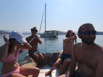 C'est le Samedi 14 Aout à 10 H du matin qu'embarquent tous mes amours... Ma belle Anita, mes petits loulou Maïa et Naël et mon chouette fiston, Loïc. Quel plaisir de vous avoir à bord. Et que la croisière commence. Un première petite étape de 15 milles et nous voilà au mouillage dans notre petite baie déserte que nous aimons tant... Mais avant tout, vite un petit plouf dans l'eau puis un bon petit Spritz, histoire de bien terminer la journée.