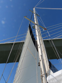 Et c'est parti pour la remontée du Guadiana. Première étape : Passer le pont. Nous partons en tout début de marée montante, pour profiter du courant et surtout avoir assez de hauteur pour passer le pont.